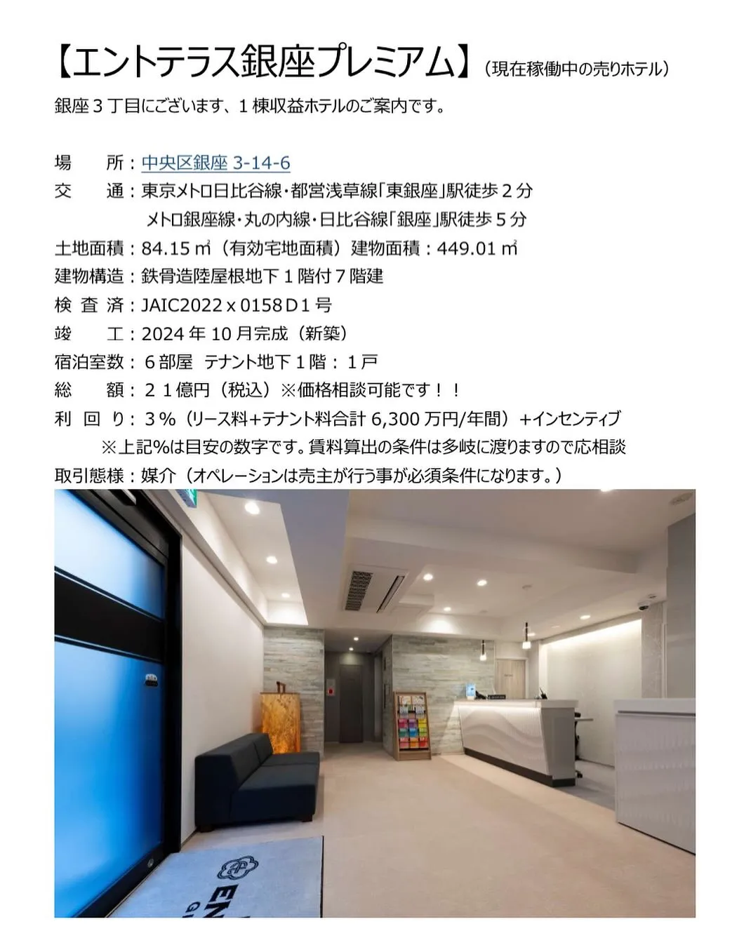 本日は中央区銀座にて売りホテルのご紹介です。